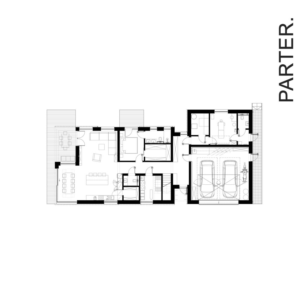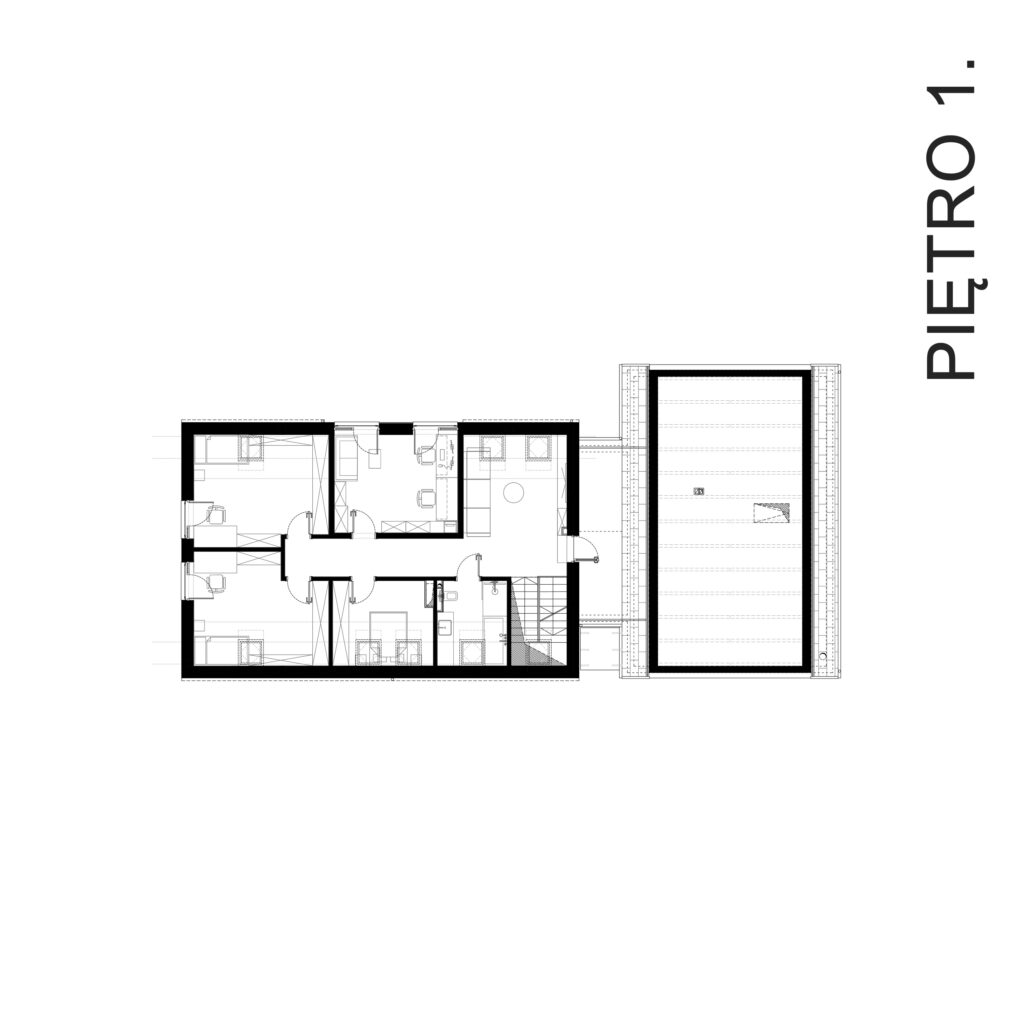 Nowoprojektowany dom wpisuje się w poniemiecką architekturę regionu poprzez zastosowanie prostych, archetypicznej form z dwuspadowymi czerwonymi dachami oraz jasnej elewacji. Budynek tworzą dwie bryły – większa z strefą mieszkalną oraz mniejsza o funkcji gospodarczej z niewielkim lokalem fizjoterapeutycznym. Obie części połączone są przeszklonym łącznikiem, który jednocześnie pełni funkcję strefy wejściowej.