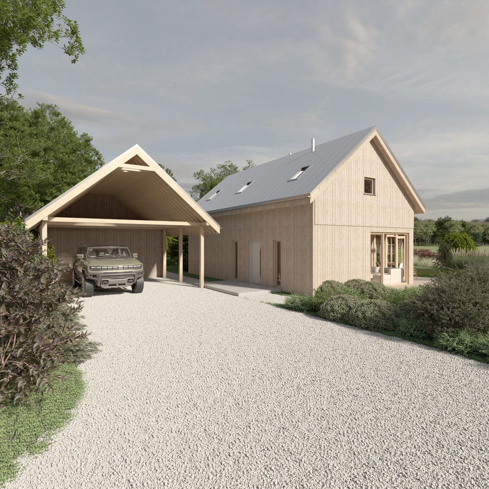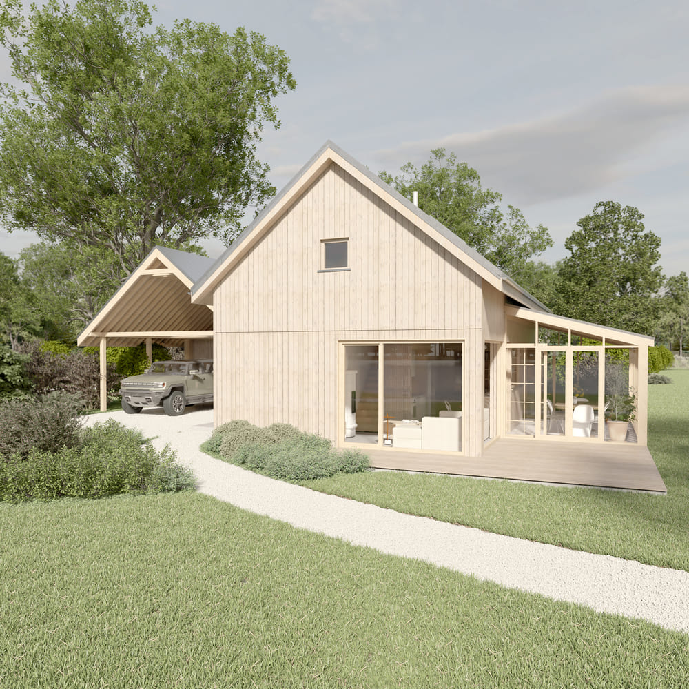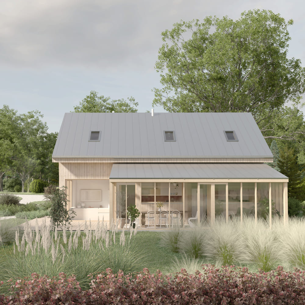Elewacja wykonana z jasnego drewna z biegiem lat zszarzeje w naturalny sposób, podkreślając ideę zmienności i cykliczności natury. Cała codzienna funkcja mieszkalna została zlokalizowana na parterze, natomiast antresola pozostaje otwartą przestrzenią – przygotowaną z myślą o odwiedzinach dzieci i wnuków.