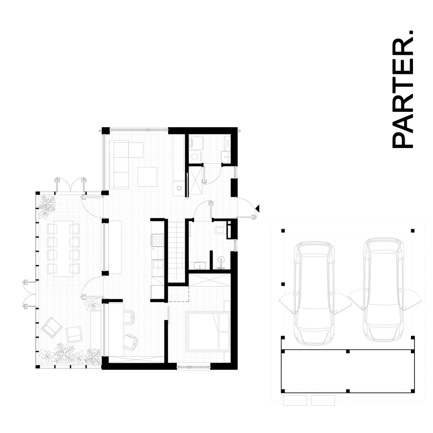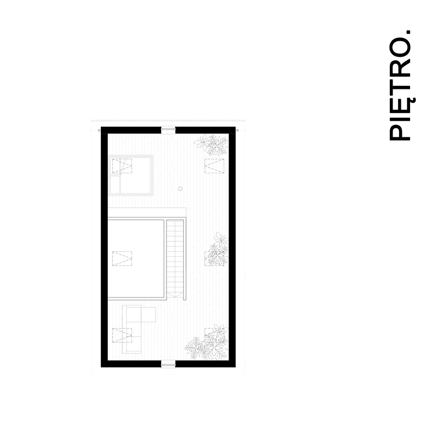 Serce domu stanowi oranżeria z dużym, rodzinnym stołem – miejsce wspólnych spotkań, rozmów i celebracji. To dom stworzony do życia w rytmie natury – niewielki, ciepły, pełen światła i zieleni.