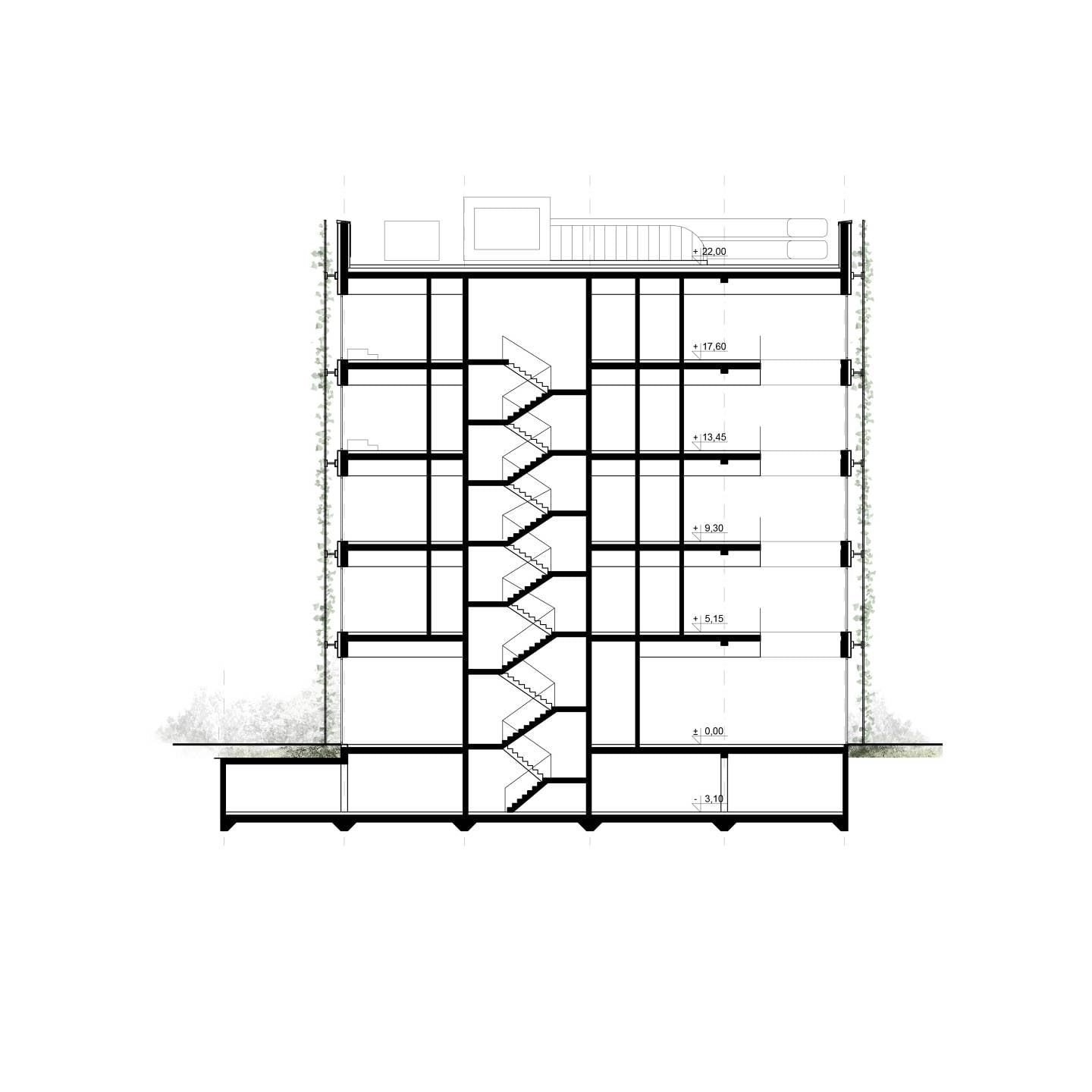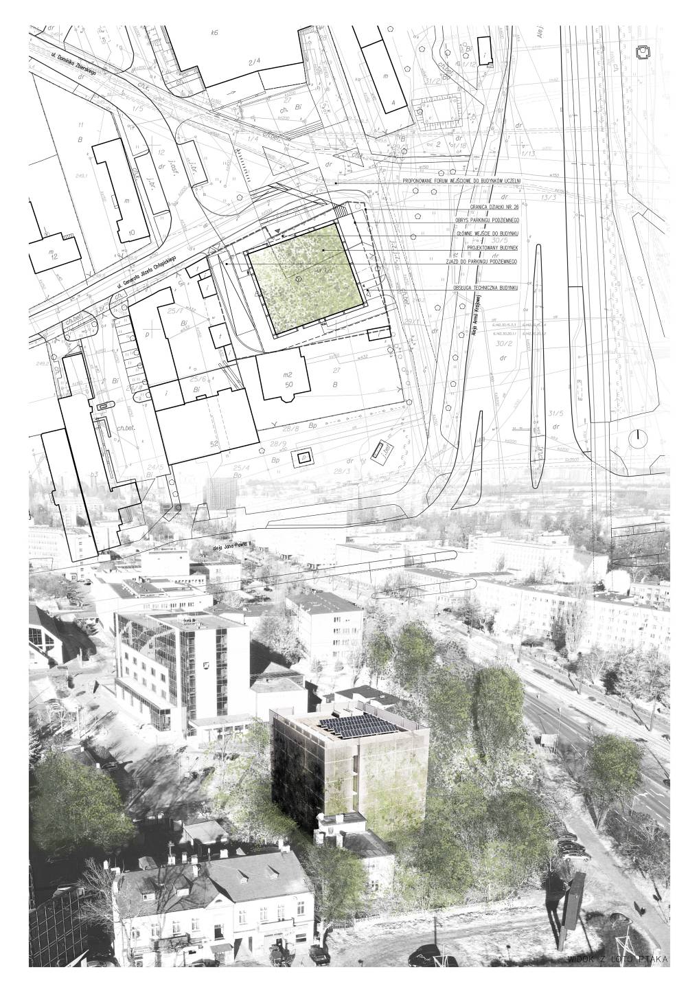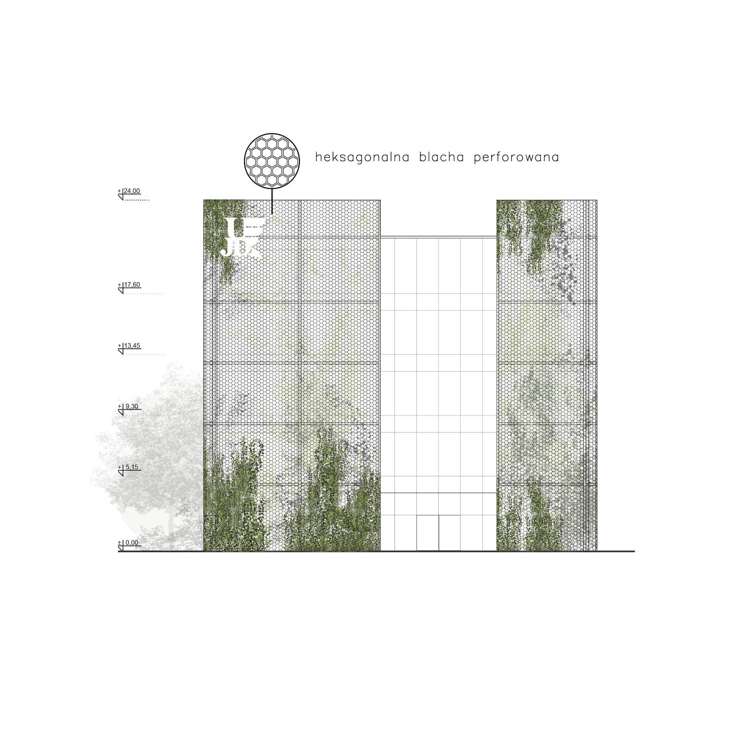 W poszukiwaniach formy i elewacji brano pod uwagę rozwiązania niewykraczające poza możliwości realizacyjne i zakładany budżet. Zaproponowano subtelną, elegancką elewację ze ścianą osłonową, po której będą wić się pnącza. Roślinność na budynku wpisze się w kontekst miasta, a budynek nabierze charakteru zielonej bryły pośród zwartej zabudowy. Projekt powstał zgodnie z założeniami architektury zrównoważonej.