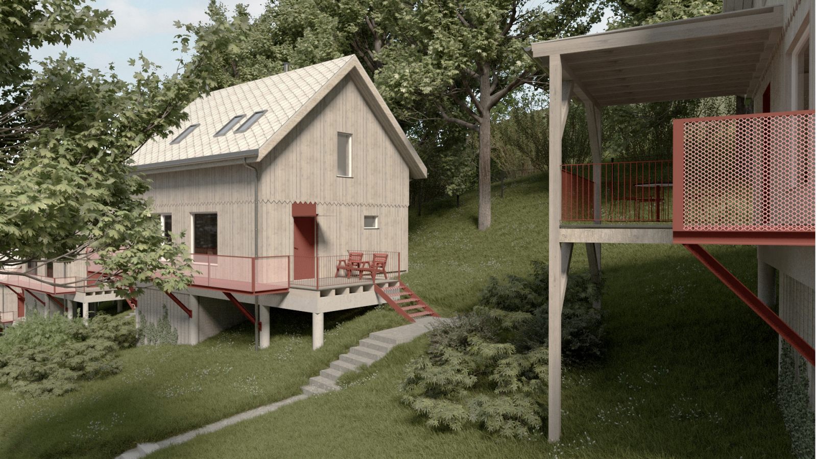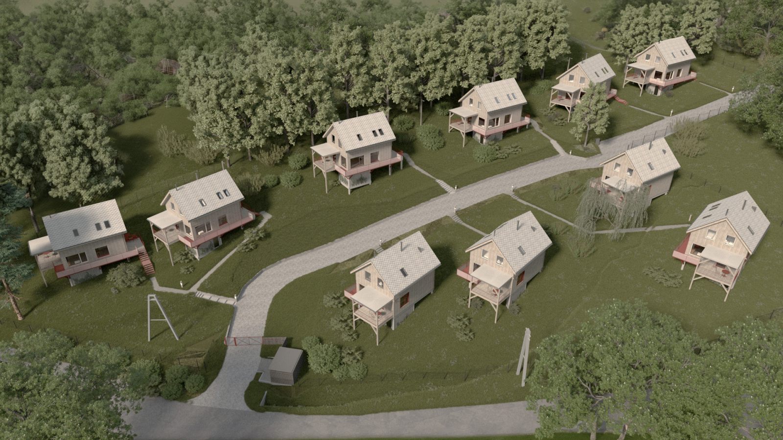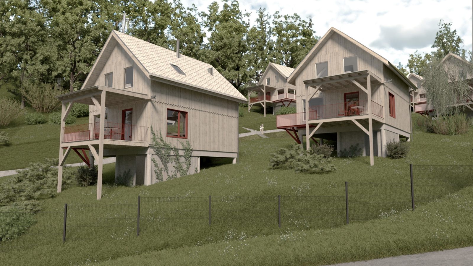 Położenie na stromym zboczu, w zbliżeniu do lasu, stworzyło niepowtarzalny kontekst do pracy nad formą i układem przestrzennym zespołu. Efektem szeregu analiz i koncepcji urbanistycznych jest kameralna grupa domków letniskowych, stanowiących idealne miejsce do wyciszenia i ucieczki od miejskiego zgiełku.