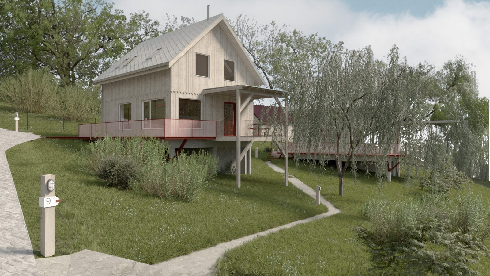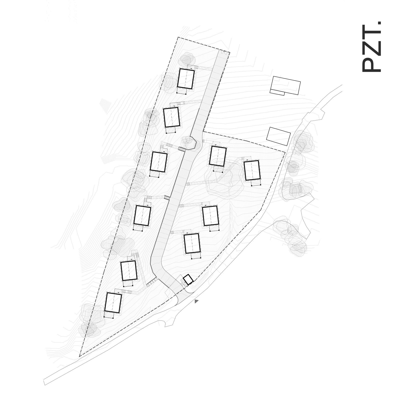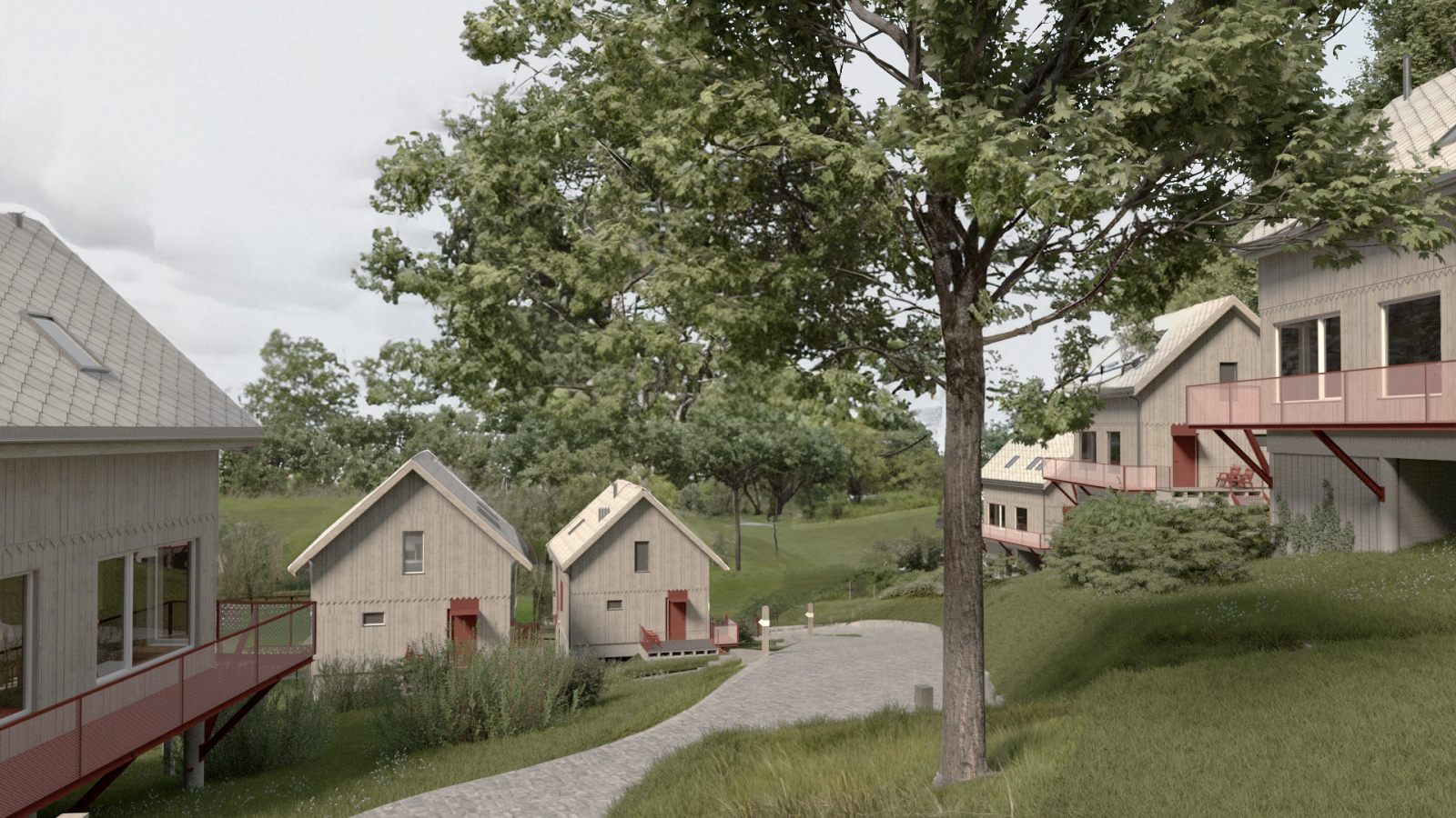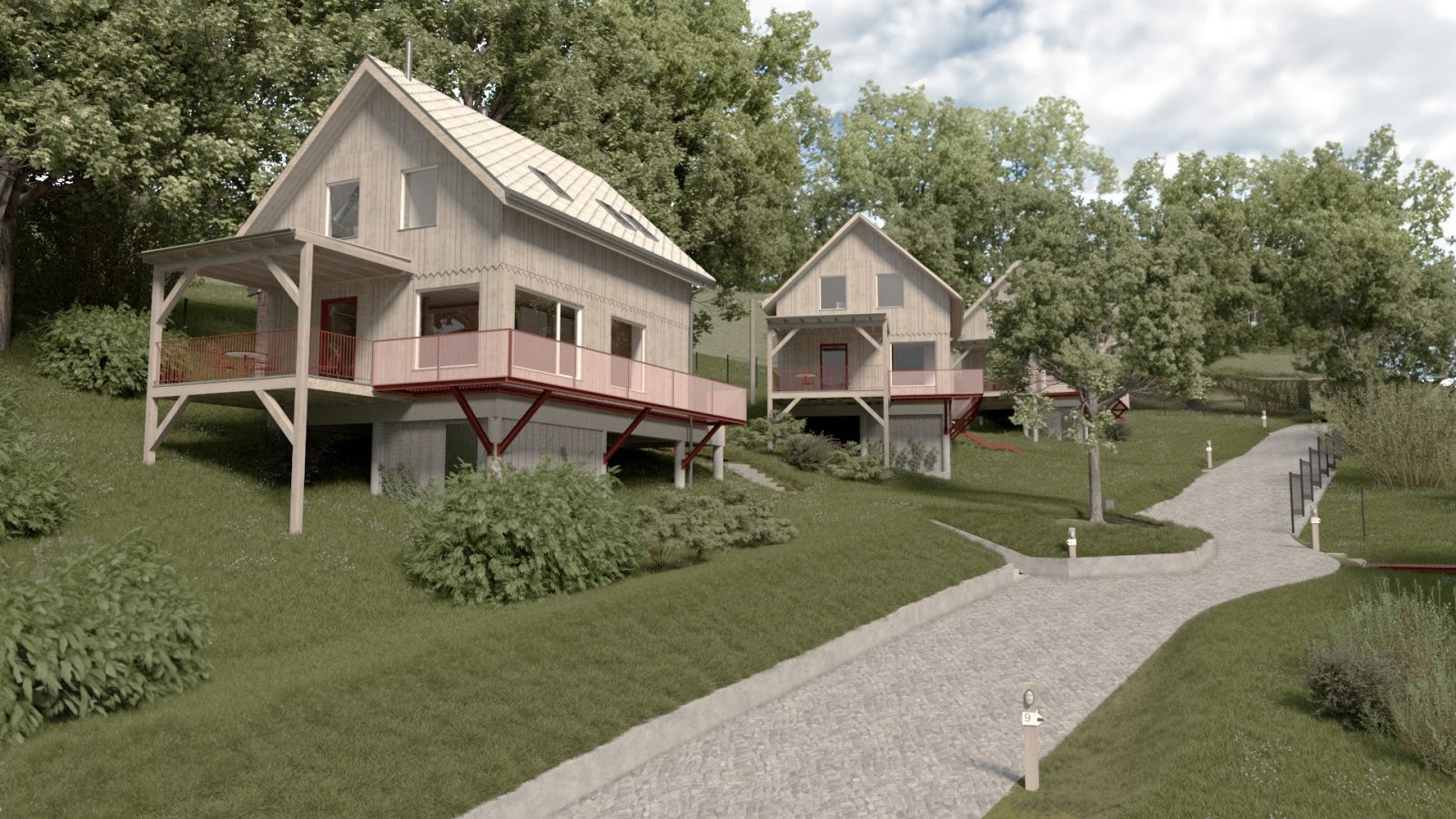 Położenie na stromym zboczu, w zbliżeniu do lasu, stworzyło niepowtarzalny kontekst do pracy nad formą i układem przestrzennym zespołu. Efektem szeregu analiz i koncepcji urbanistycznych jest kameralna grupa domków letniskowych, stanowiących idealne miejsce do wyciszenia i ucieczki od miejskiego zgiełku.