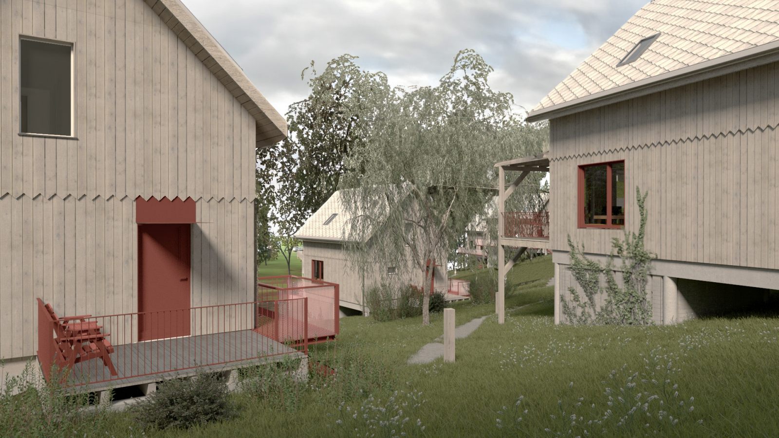 Aby harmonijnie wpisać projekt w lokalny krajobraz i tradycję budowlaną, przeprowadzono analizę architektury regionalnej. Wnioski z tych badań znalazły odzwierciedlenie w formie obiektów. Charakterystycznym akcentem są nowoczesne detale w postaci czerwonych elementów, które przełamują klasyczną formę i dodają jej wyrazistości, kontrastując z naturalną, drewnianą elewacją.