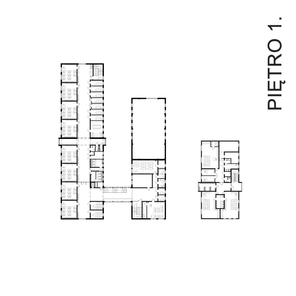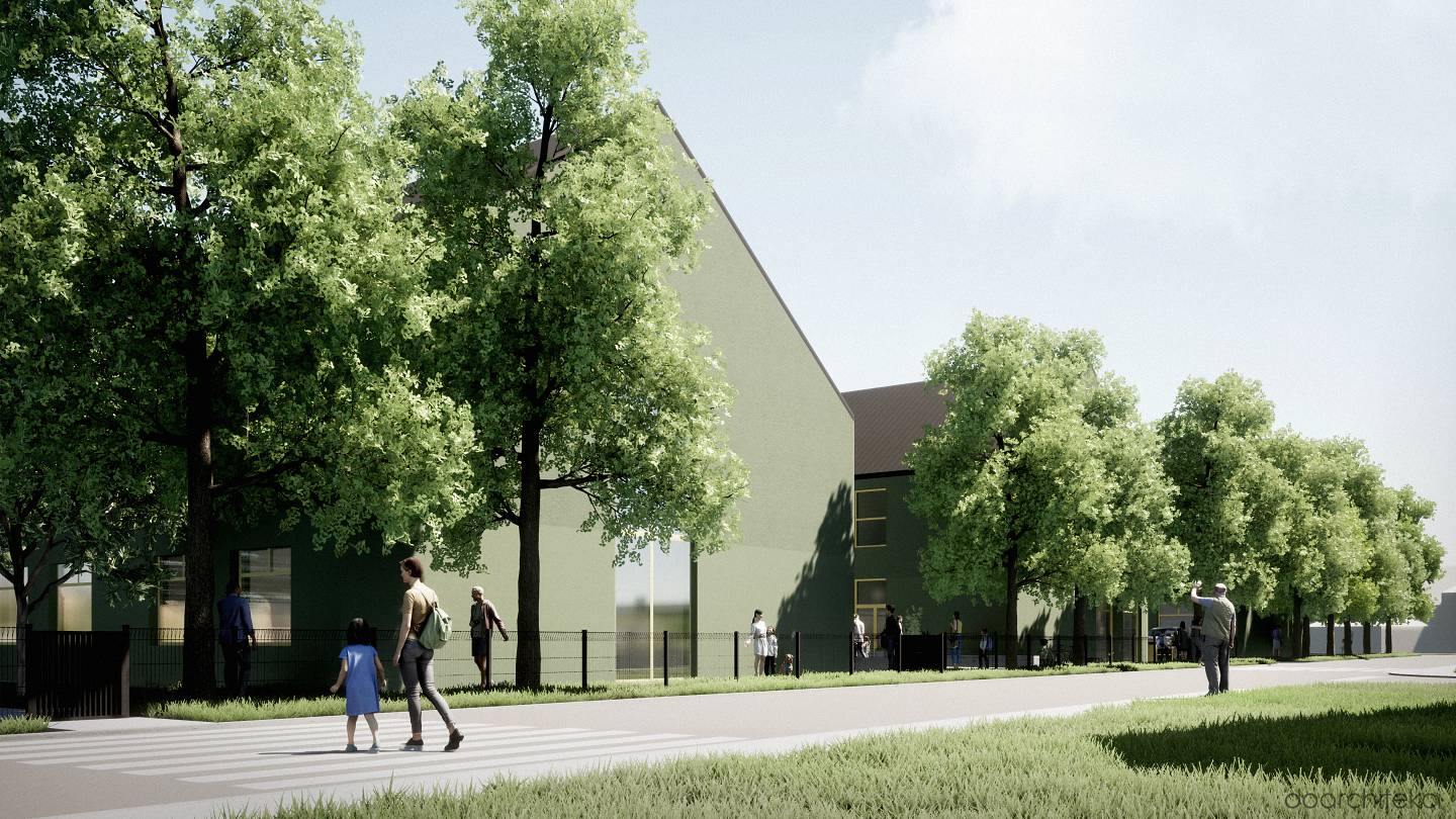Koncepcja projektowa dotyczy nowoczesnego kompleksu edukacyjnego zlokalizowanego w sercu osiedla domów jednorodzinnych w okolicach Wrocławia. Układ urbanistyczny opiera się na trzech prostopadłościennych bryłach z dwuspadowymi dachami, ustawionych równolegle, co tworzy spójną i harmonijną kompozycję. Stopniowe wydłużanie budynków nadaje im dynamiczny, schodkowy układ.