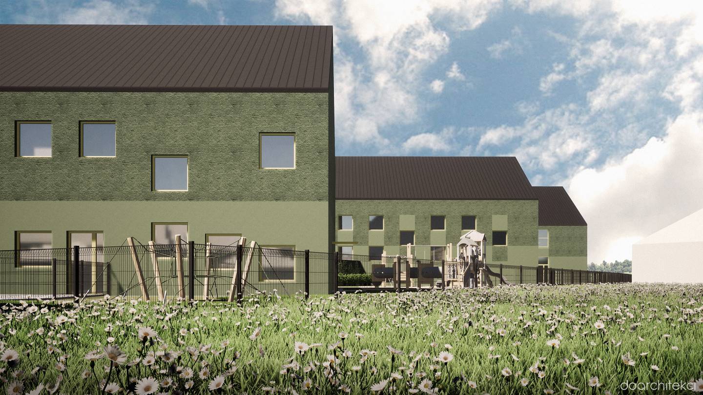Siedziba niepublicznej szkoły została zaprojektowana jako obiekt składający się z dwóch skrzydeł połączonych przeszklonym, dwupoziomowym łącznikiem. Z kolei sześciooddziałowe publiczne przedszkole mieści się w dwukondygnacyjnym budynku, którego wejście wyróżnia subtelnie wysunięta fasada. Elewacje, utrzymane w odcieniach zieleni o zróżnicowanej fakturze, harmonijnie wpisują się w otoczenie, nadając budynkom nowoczesny i przyjazny charakter.